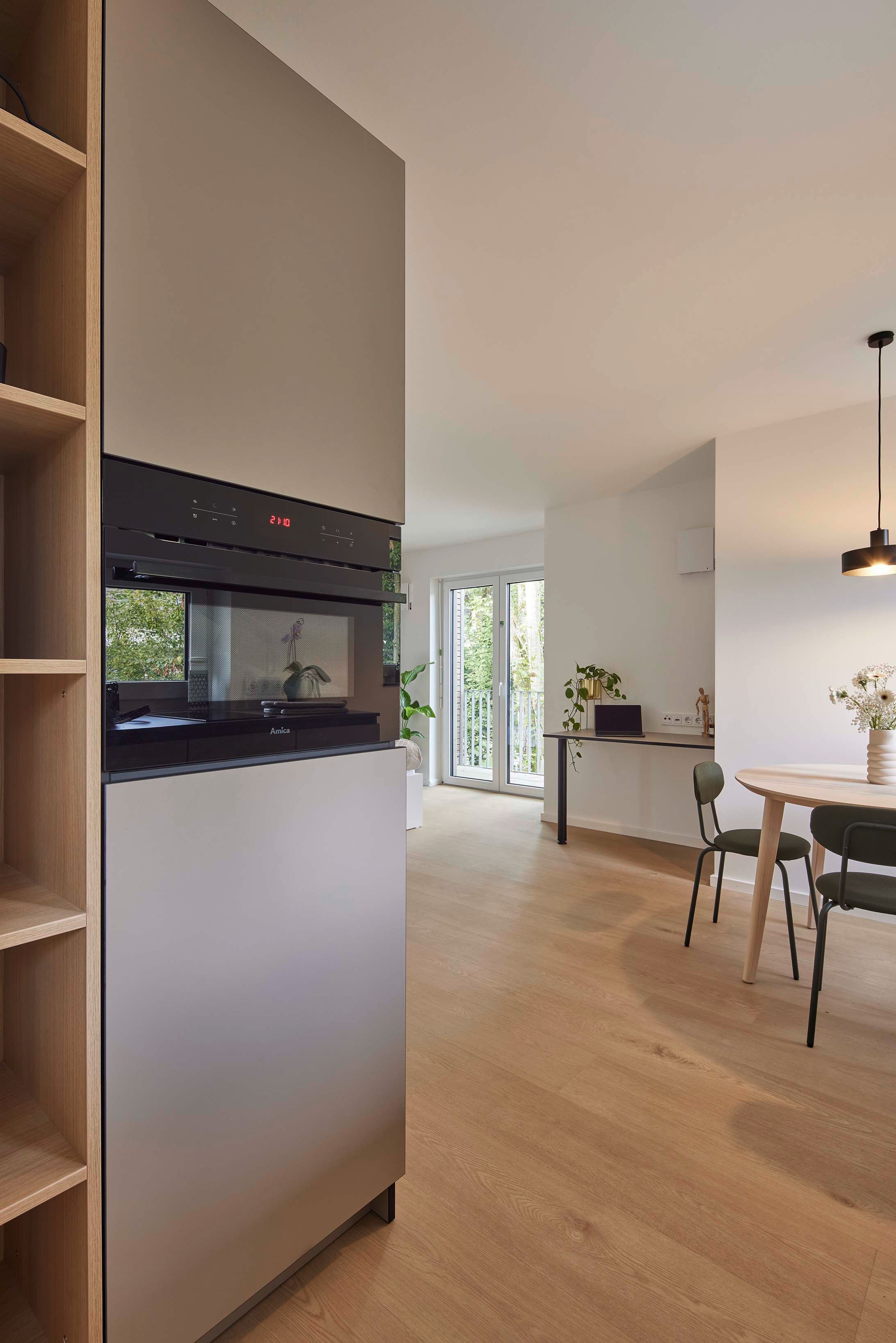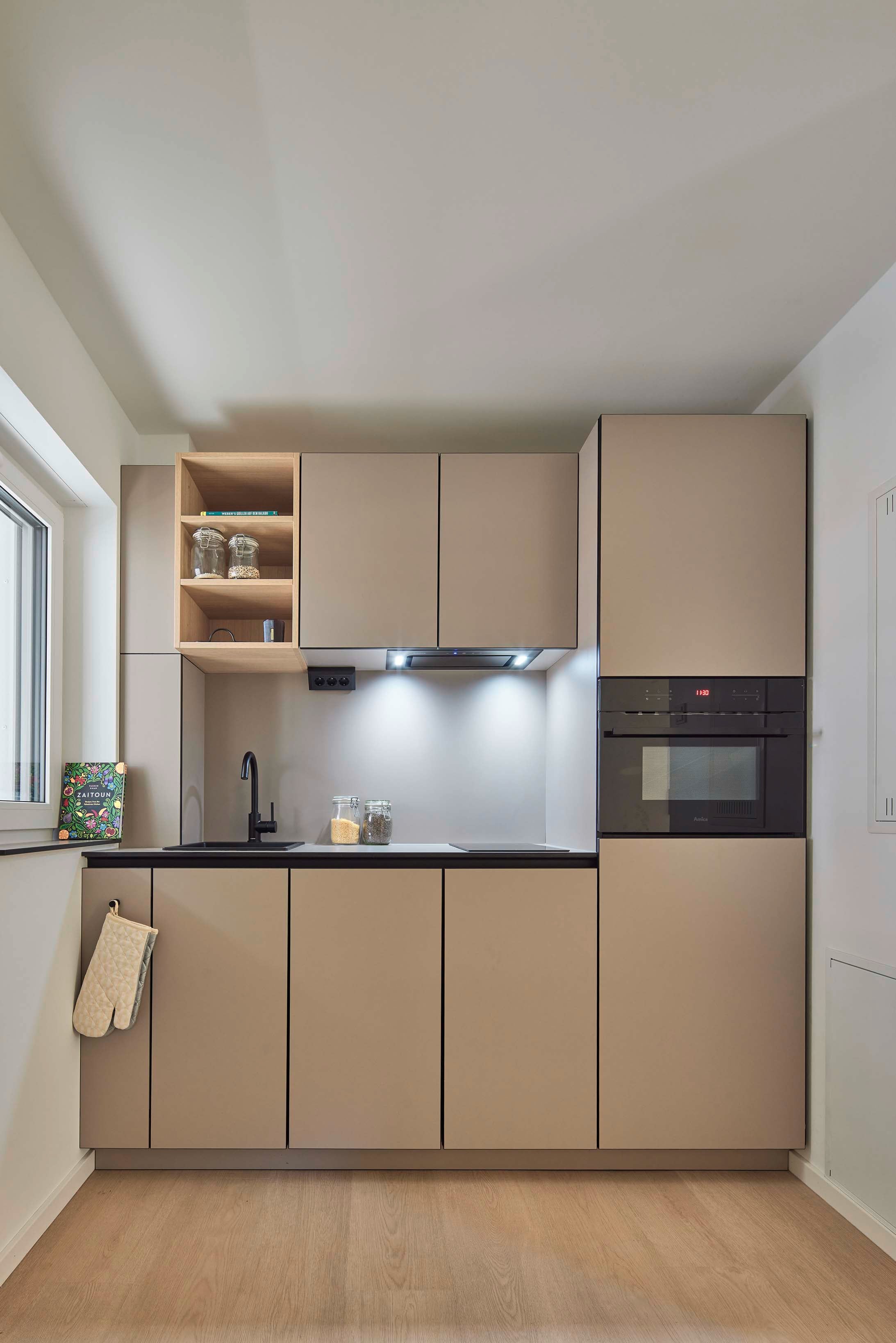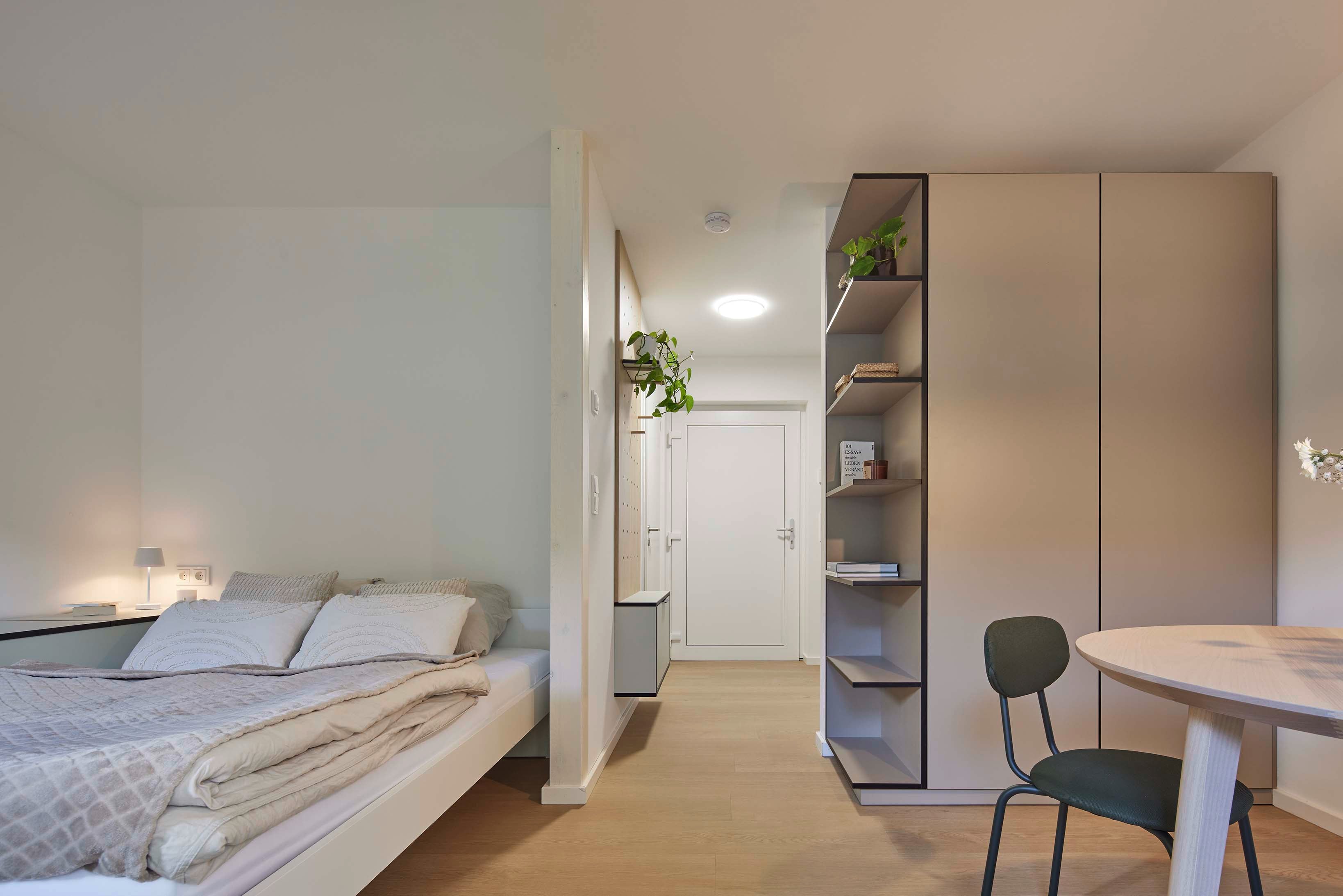 Das offene Raumkonzept jedes Apartments umfasst eine Einbauküche, Garderobe mit Schuhschrank, eine kompakte Essecke, einen Arbeitsbereich sowie einen Schlafbereich mit integrierten Stauraumlösungen. Gerade diese maßgeschneiderten Elemente sind das zentrale Gestaltungsthema des Projekts: Sie schaffen Ordnung, Struktur und gleichzeitig eine gemütliche Wohnatmosphäre auf kleinem Raum.