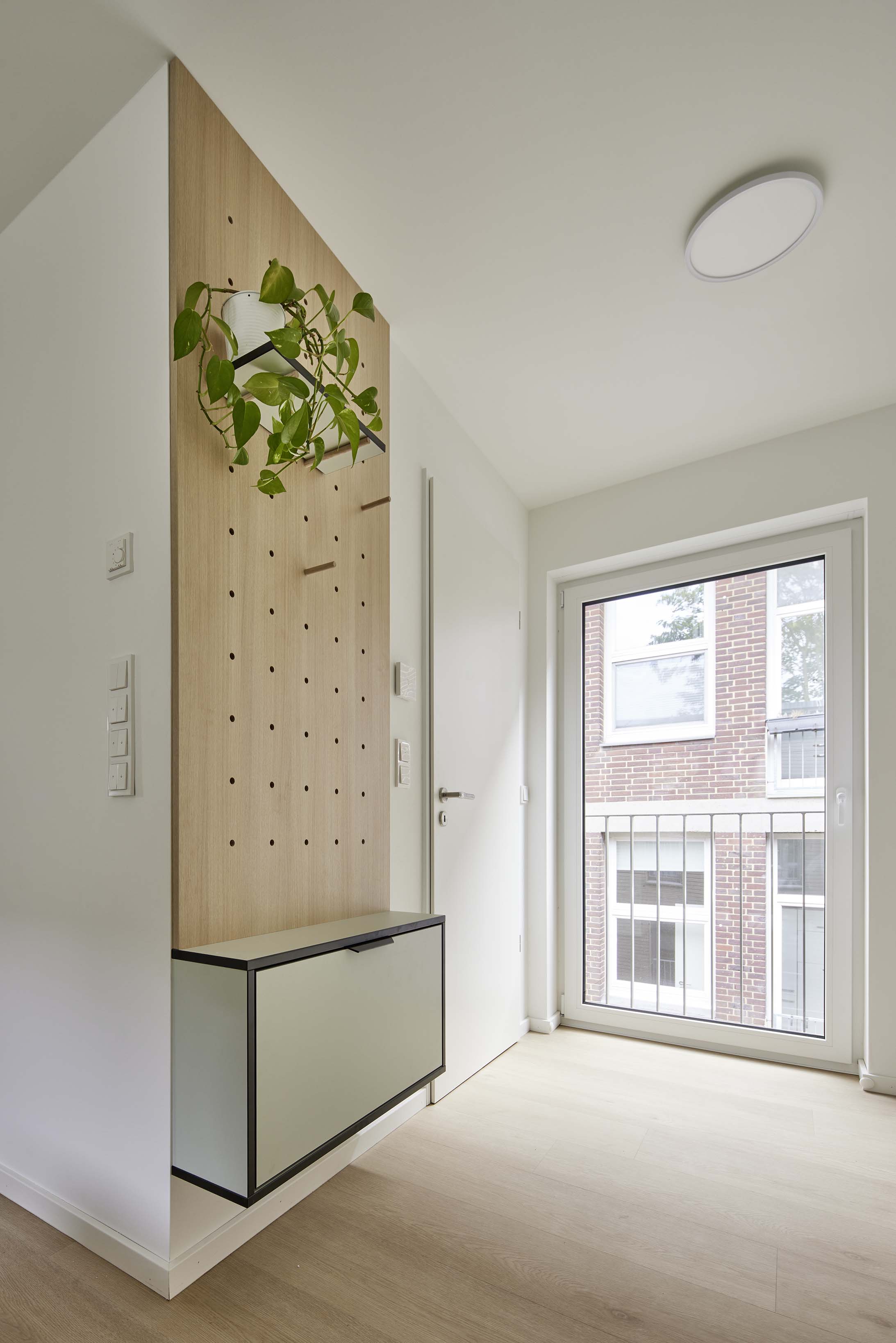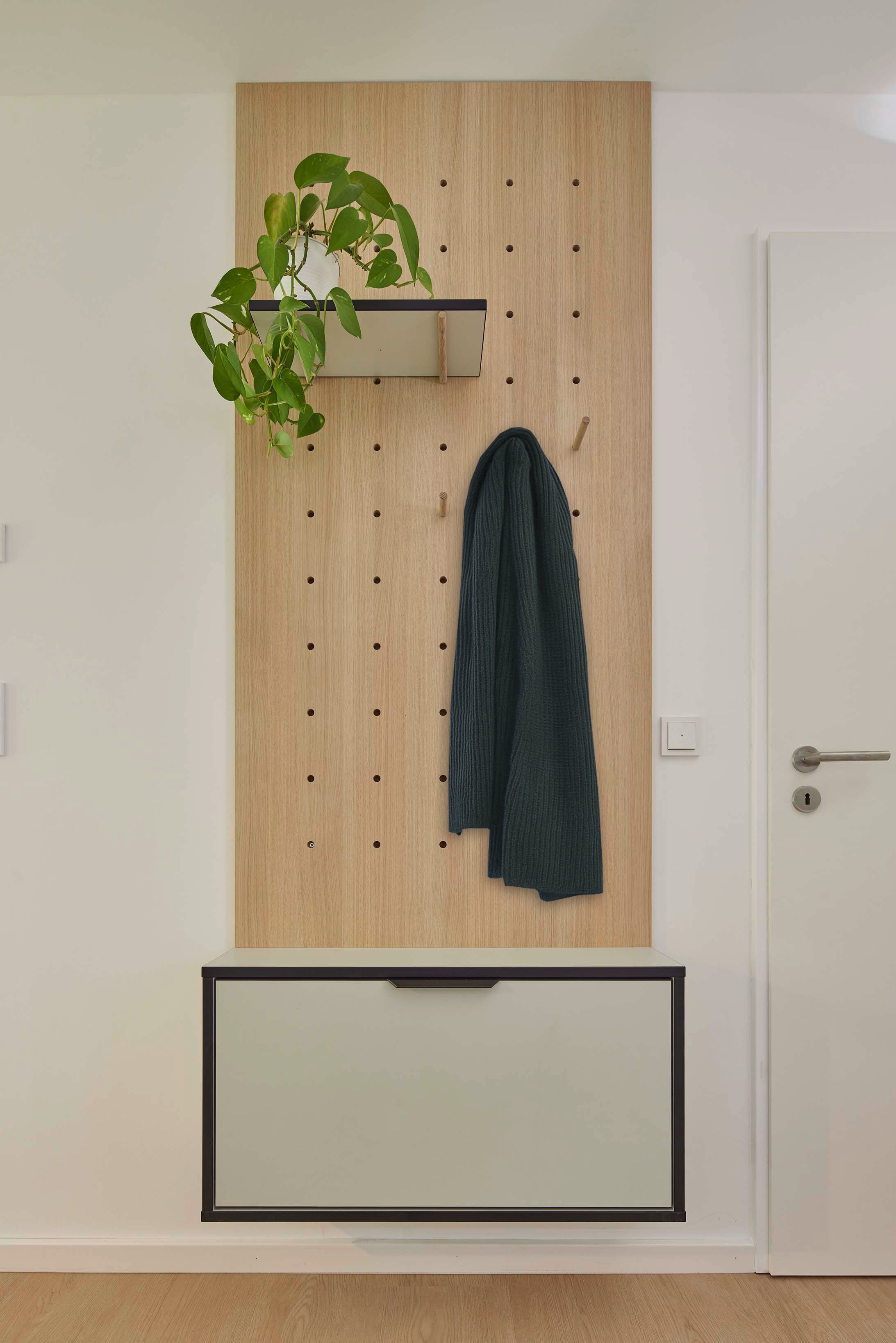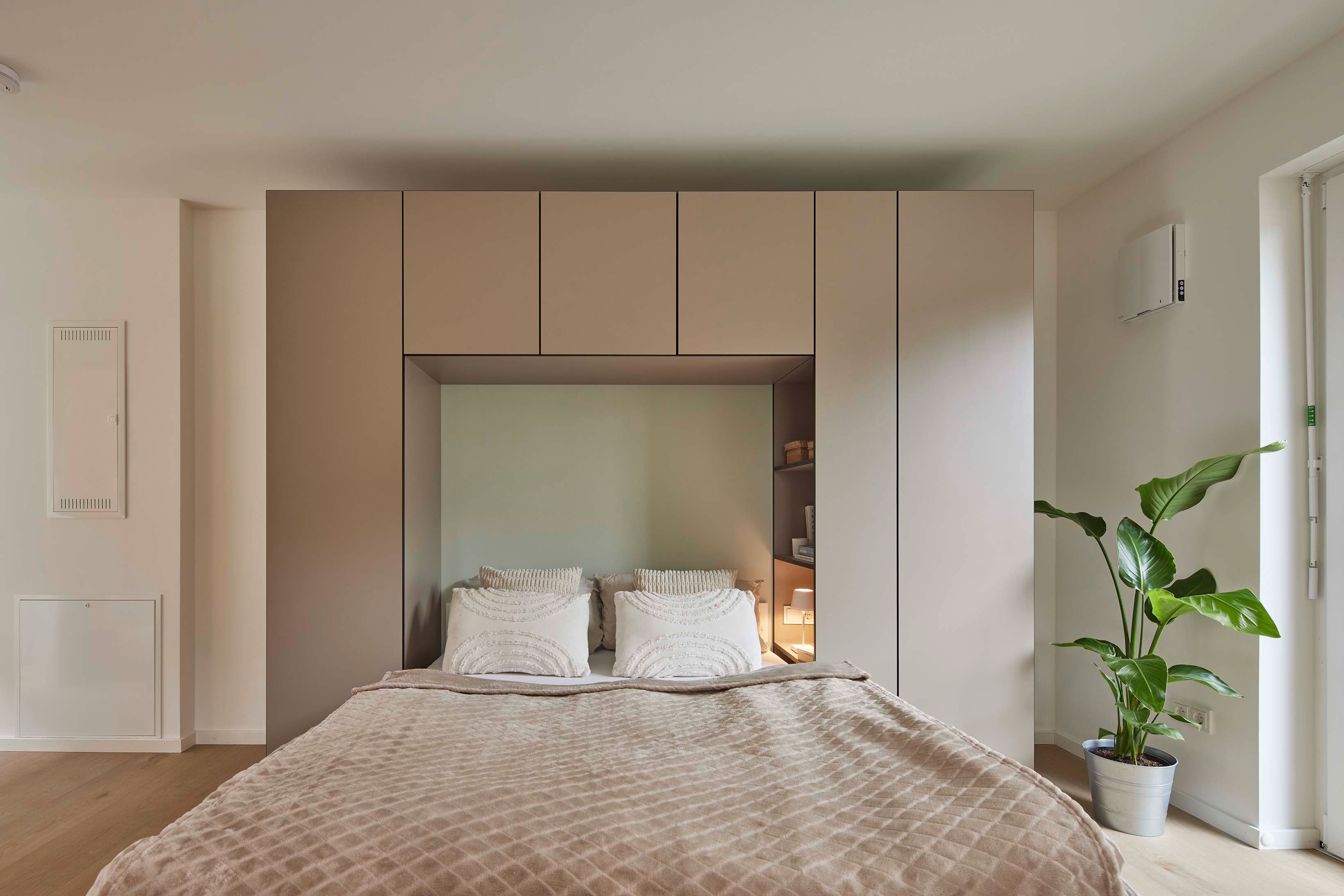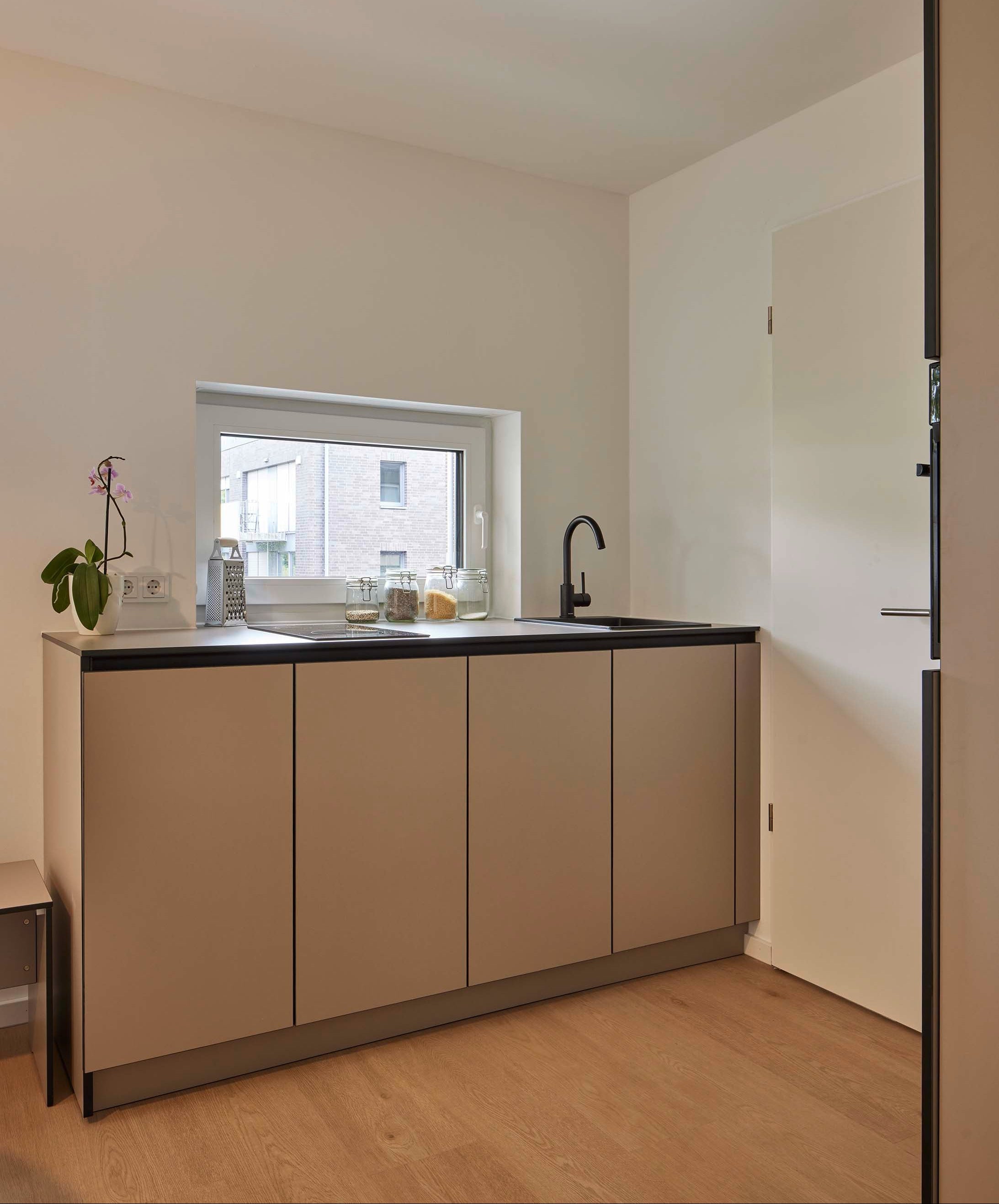 Das offene Raumkonzept jedes Apartments umfasst eine Einbauküche, Garderobe mit Schuhschrank, eine kompakte Essecke, einen Arbeitsbereich sowie einen Schlafbereich mit integrierten Stauraumlösungen. Gerade diese maßgeschneiderten Elemente sind das zentrale Gestaltungsthema des Projekts: Sie schaffen Ordnung, Struktur und gleichzeitig eine gemütliche Wohnatmosphäre auf kleinem Raum.