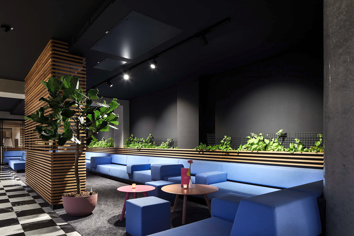 We were commissioned to design and implement the organic bar, room dividers, and lounge area with horizontally placed oak slats.