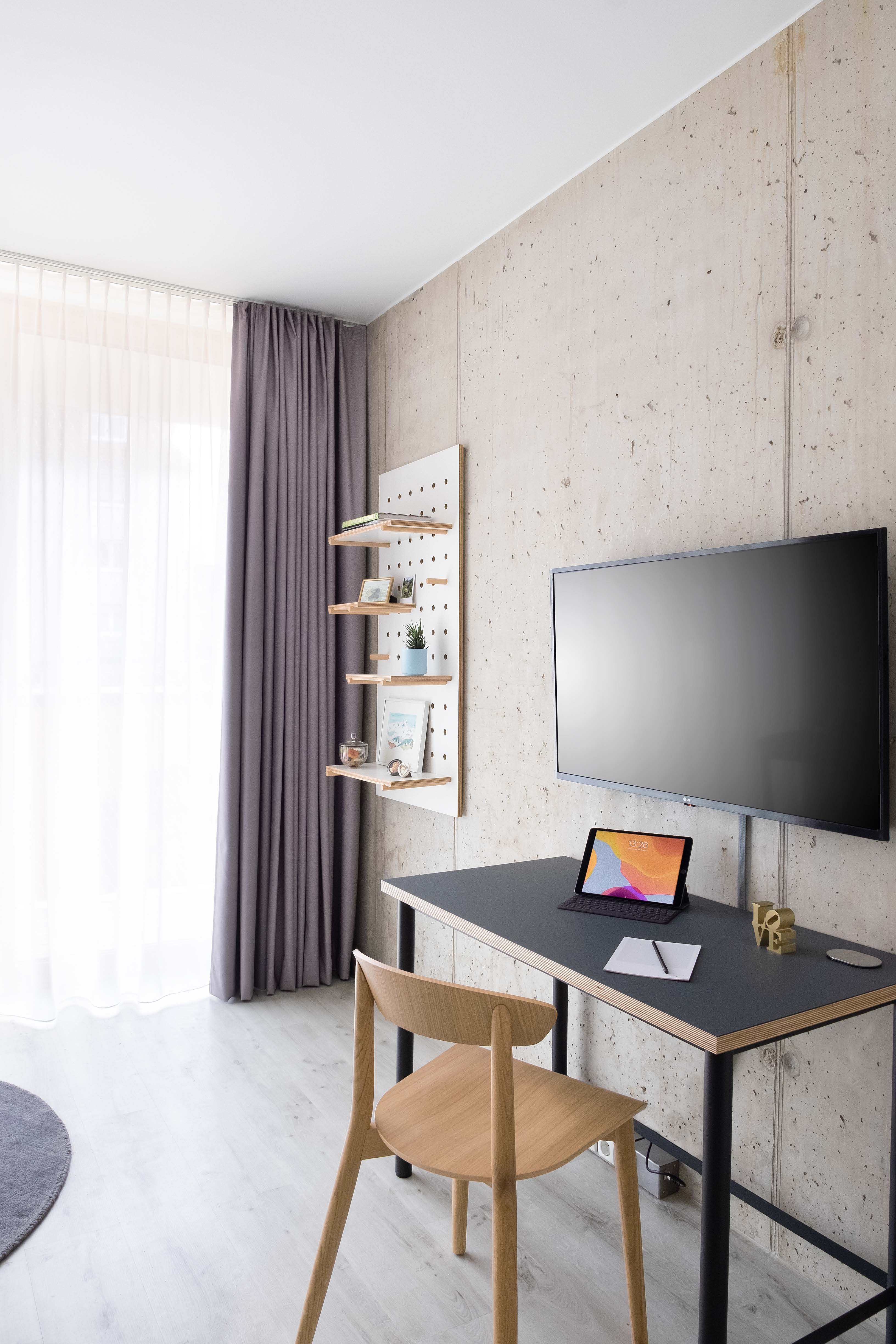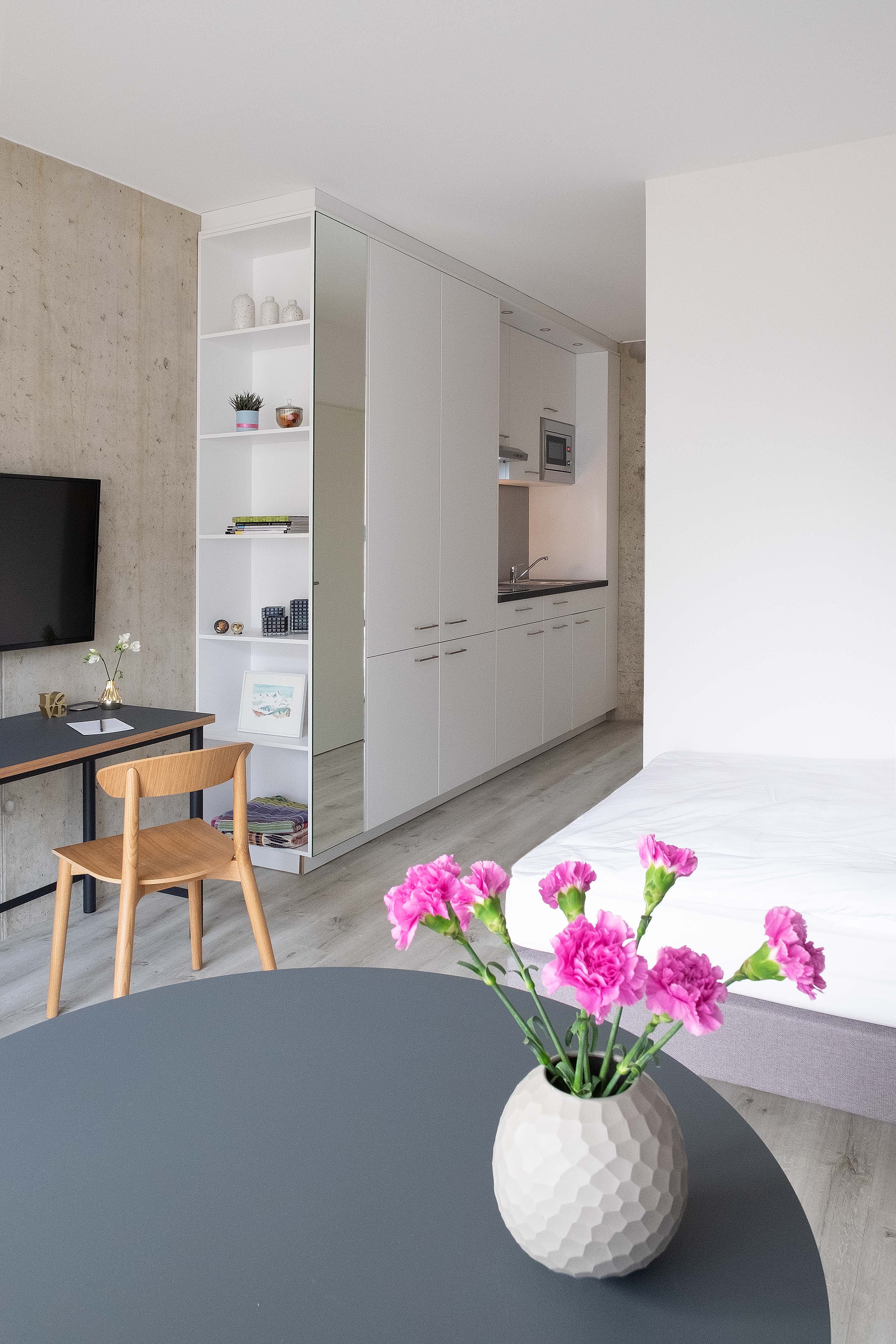 The modernly equipped apartments are located in a 14-story building in a central location in Essen. The rooms are equipped with over 300 conmoto products, creating a stylish atmosphere and offering all the necessary comforts. We contributed various services to the one-room apartment project, including the design of the furniture and furnishings, prototype construction, product engineering, project management and logistics, and project implementation.