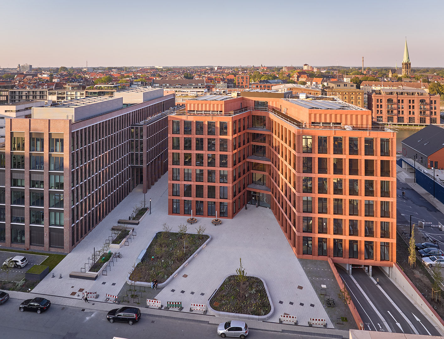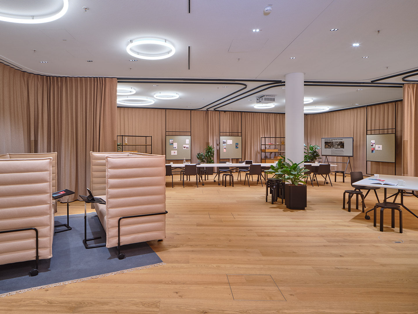A modern interior design concept was implemented for FIEGE's new competence centers at Münster Harbor, combining functionality and aesthetics. The design includes flexible spaces tailored to the diverse demands of everyday work.