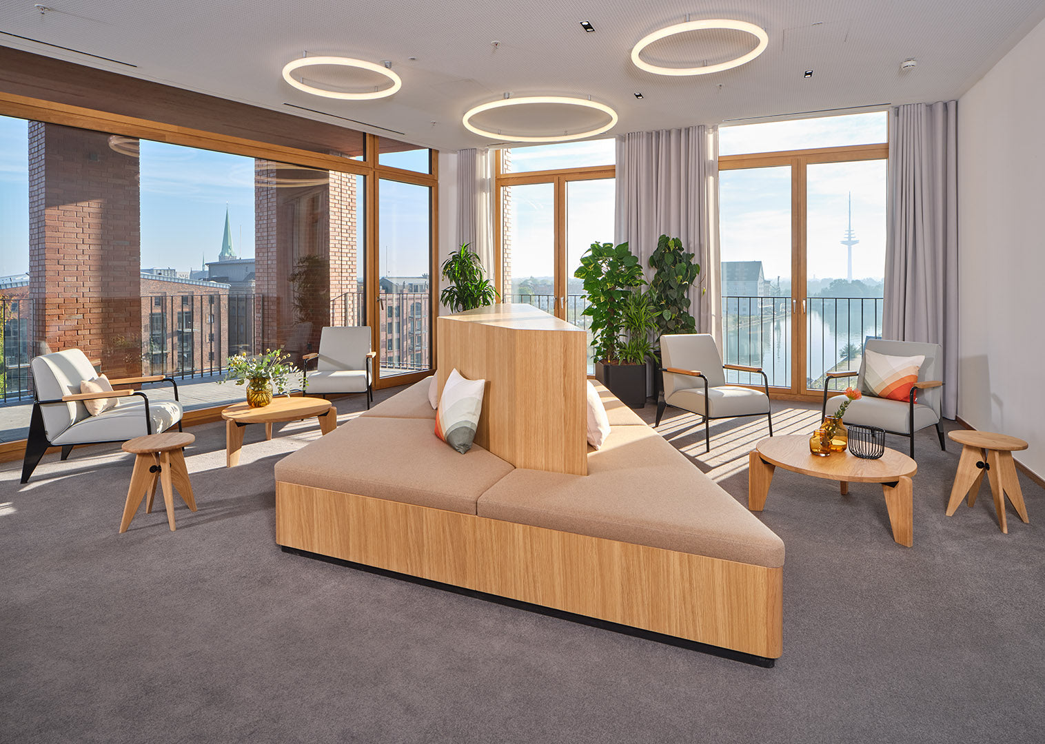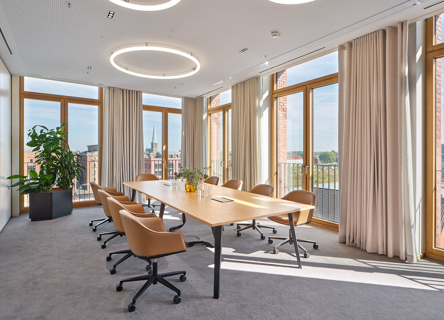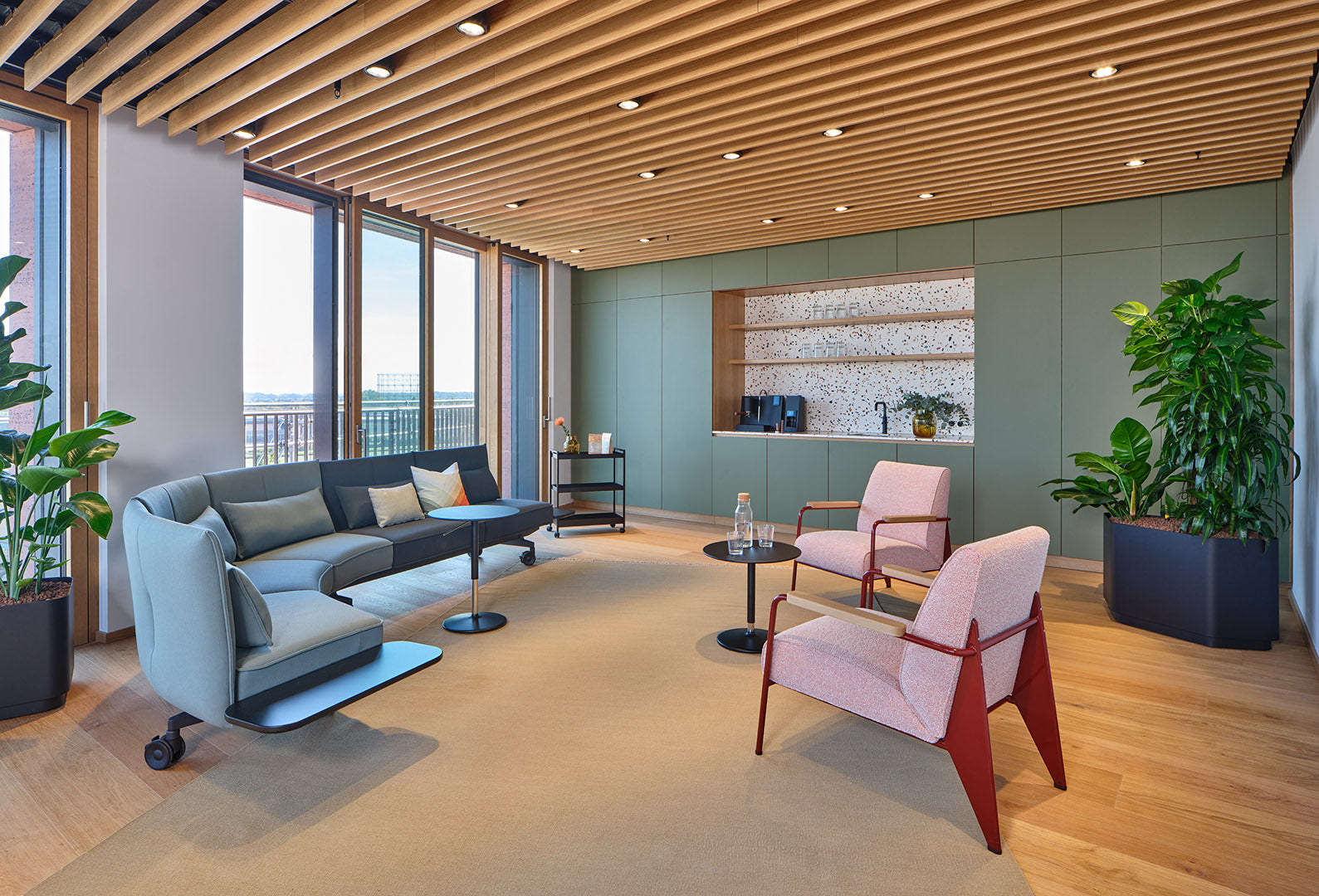 The reception area, meeting rooms, common and communication areas, and work spaces combine clear structures with high-quality materials and intelligent detail solutions. The concept is complemented by the comfortably designed break-out room, which serves as a retreat.