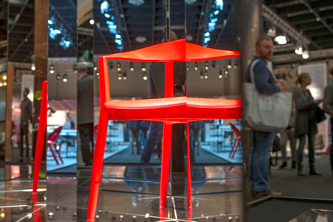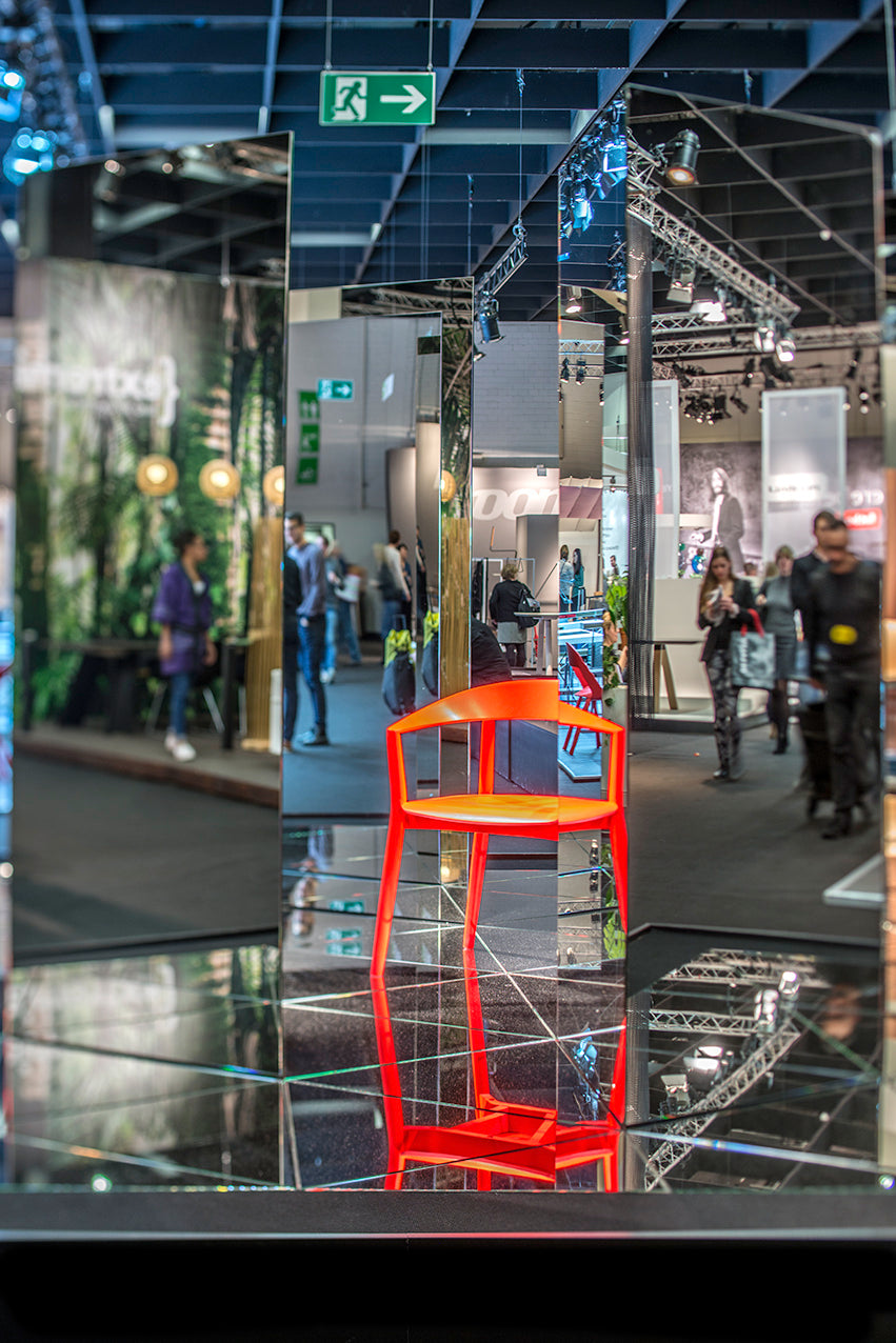 Viewers of Pascal Bosetti's installation at imm cologne will experience a similar experience: For conmoto, the young designer has created an oversized kaleidoscope that seemingly fragments and multiplies the "Mito" chair – and, depending on where the viewer moves, continually reassembles it into a new image.