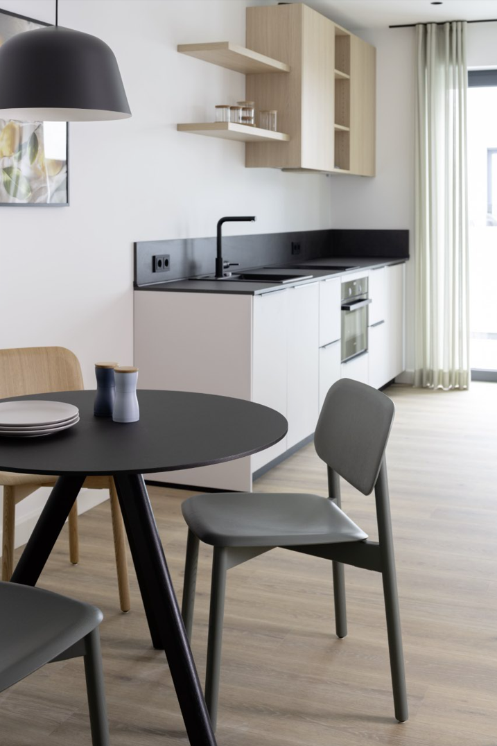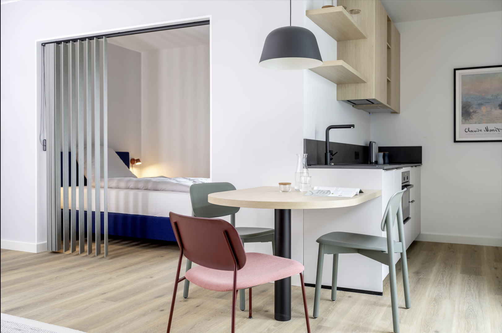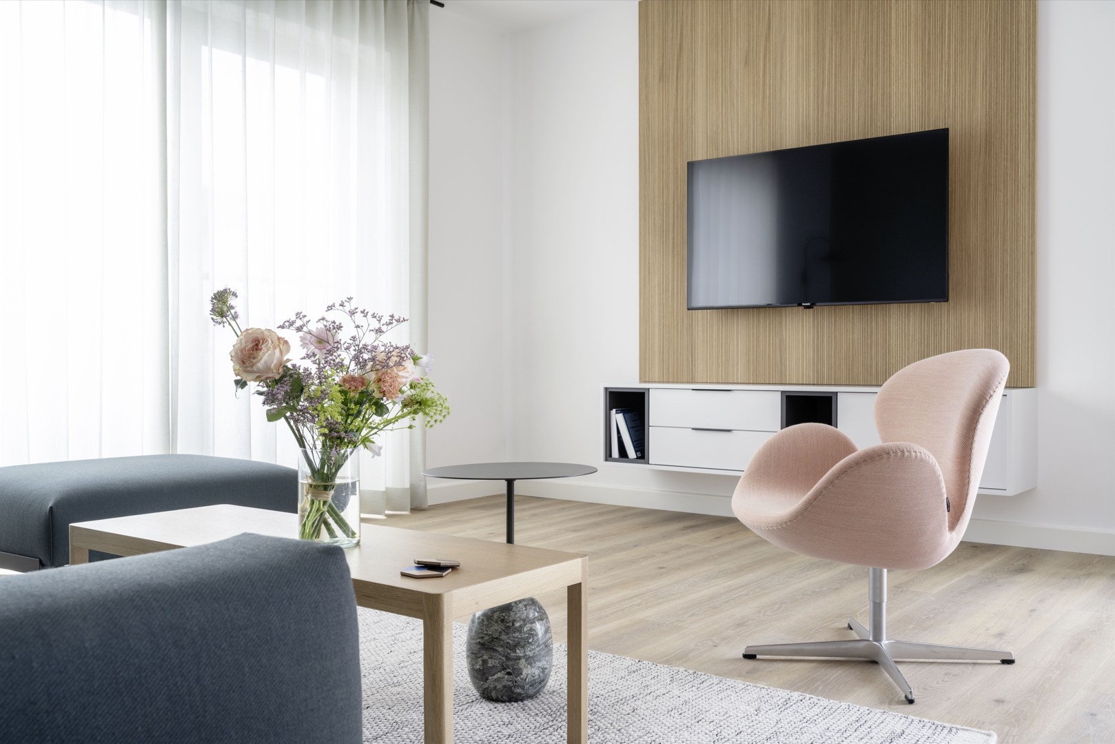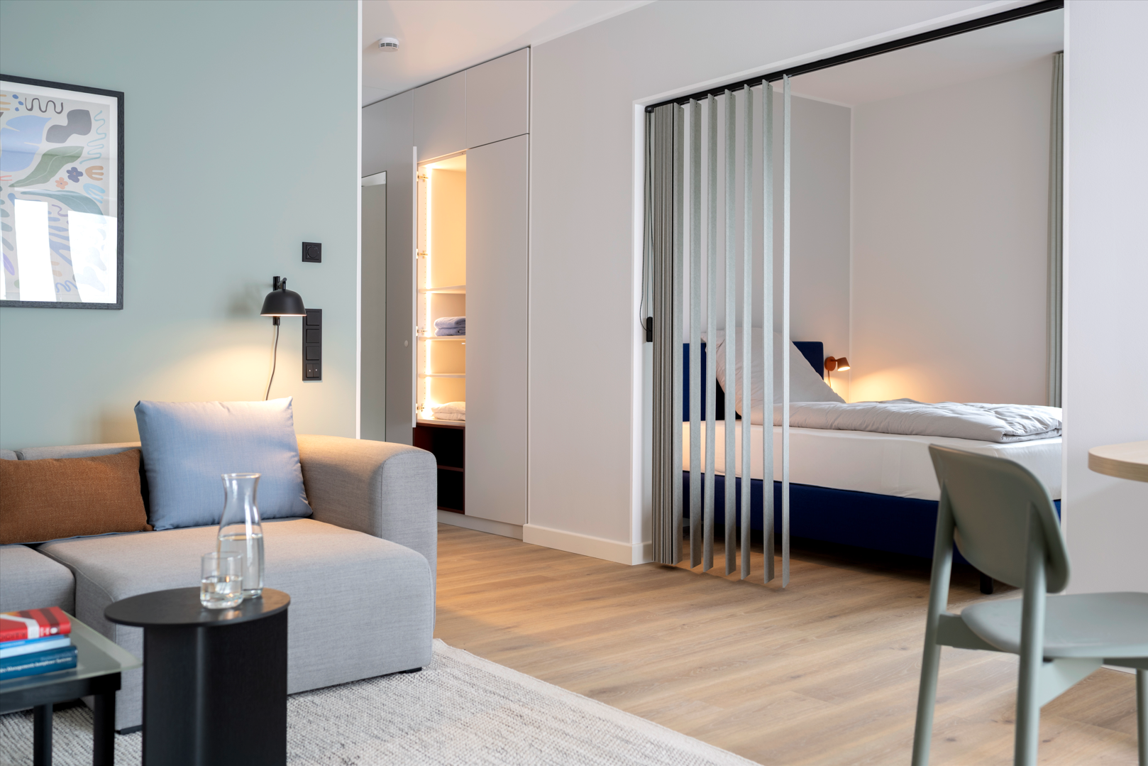 To meet the diverse needs of guests, two apartment sizes were developed: more compact units for shorter stays and more spacious apartments offering more space and comfort for longer stays. Both variants feature high-quality furnishings, a clear design language, and exclusive details.