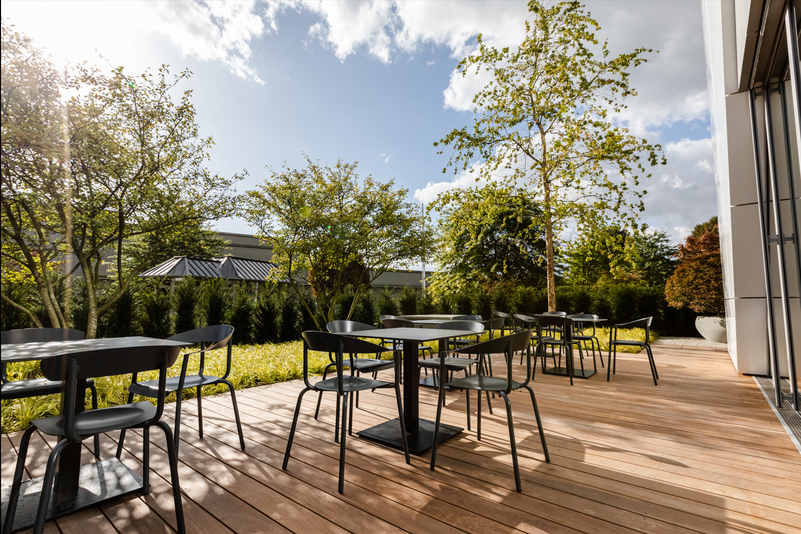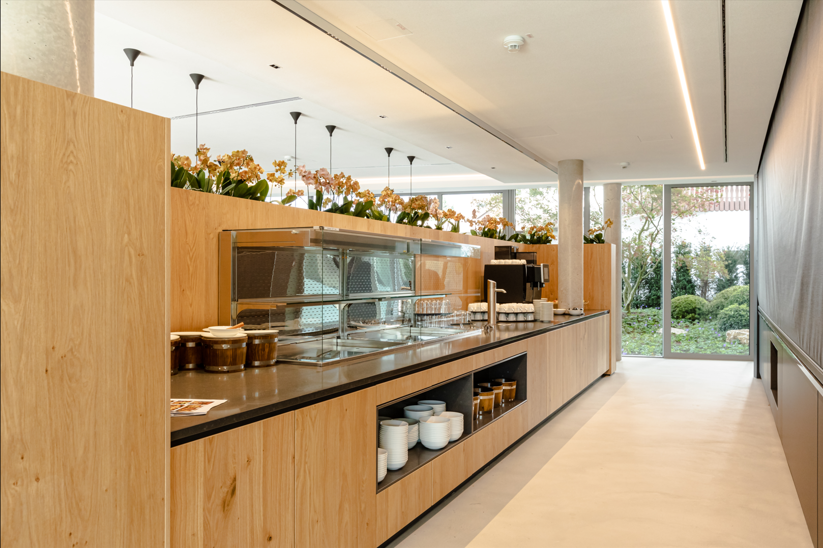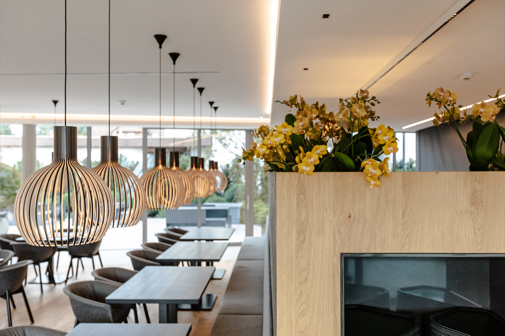 For the perfect seating, we chose armchairs and bar stools from the CHAIRMAN series, as well as the MITO armchair made of oak. The MITO ALU chair in black powder-coated aluminum complements the outdoor area. Another highlight is the built-in furniture we manufactured, such as the food counter and the oak service furniture. We also developed a planting concept that creates a pleasant atmosphere. We also rely on comfortable upholstered furniture to create a relaxed atmosphere.