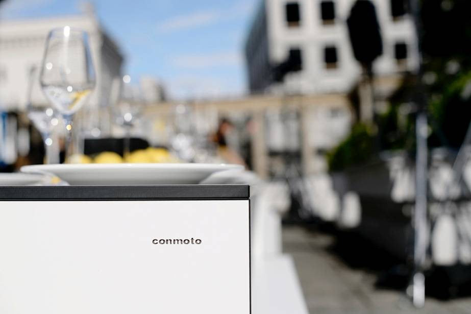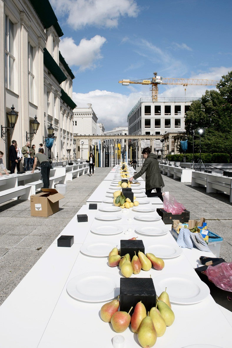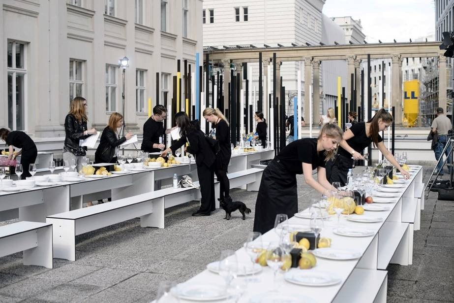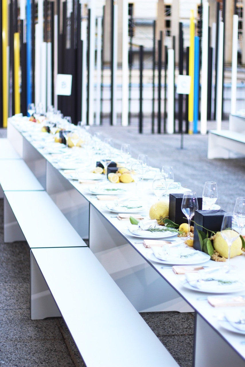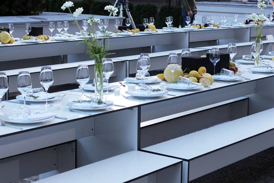 Leyla Piedayesh, founder of the lala Berlin label, draws inspiration for her designs from light, so it was only logical to hold the label's fashion show outdoors. Naturally, the show was equipped with event furniture that matched the exclusive location: the Kronprinzenpalais, directly on Berlin's magnificent Unter den Linden boulevard. On the terrace of the Prussian rulers' city palace, the RIVA combination was once again in use. The puristic furniture was arranged into long rows of tables – functional chic, entirely in keeping with the elegant street fashion of the lala Berlin label.