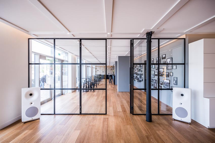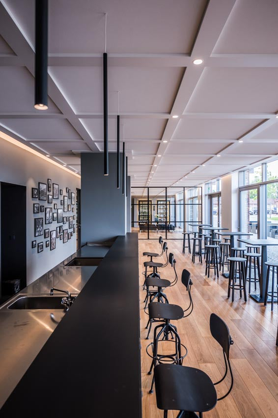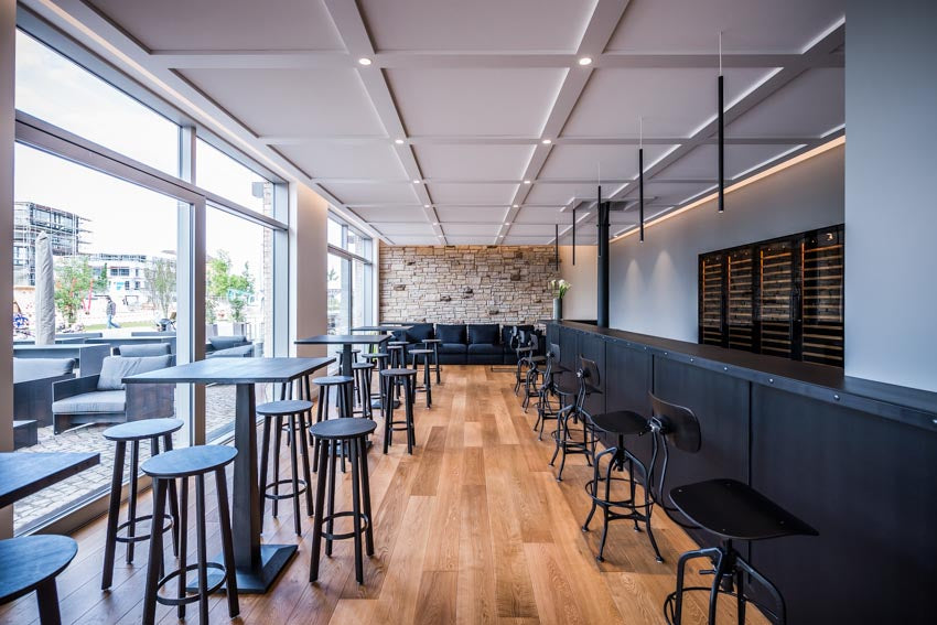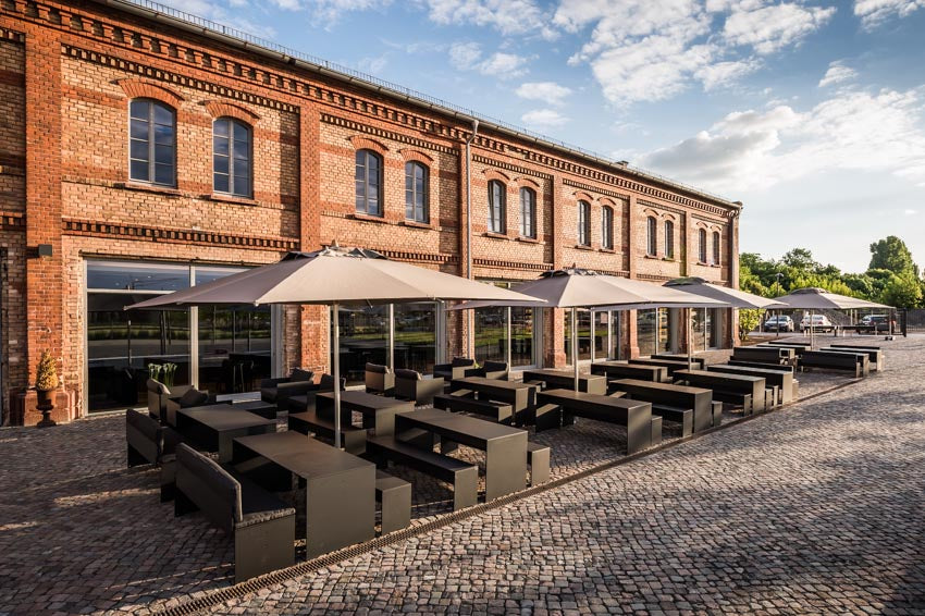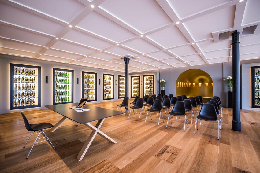 The clean lines and subtle colors of the RIVA series and the "X-Man" table by conmoto blend skillfully with the industrial charm of the old barracks building. This stylistic line serves as a contrasting backdrop, giving more space and significance to the room's details. These include the oak parquet flooring with inlays made from real wine barrels and the sculpture of Saint Urban, the patron saint of winemakers and vineyards.