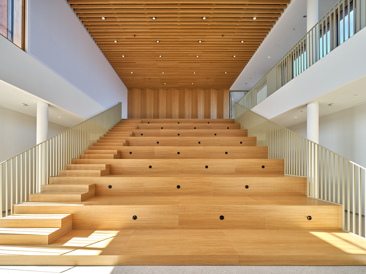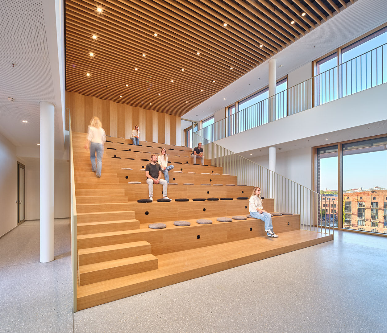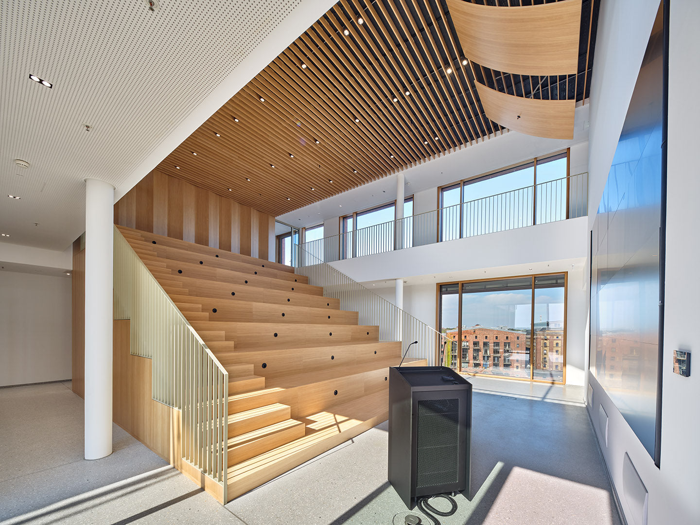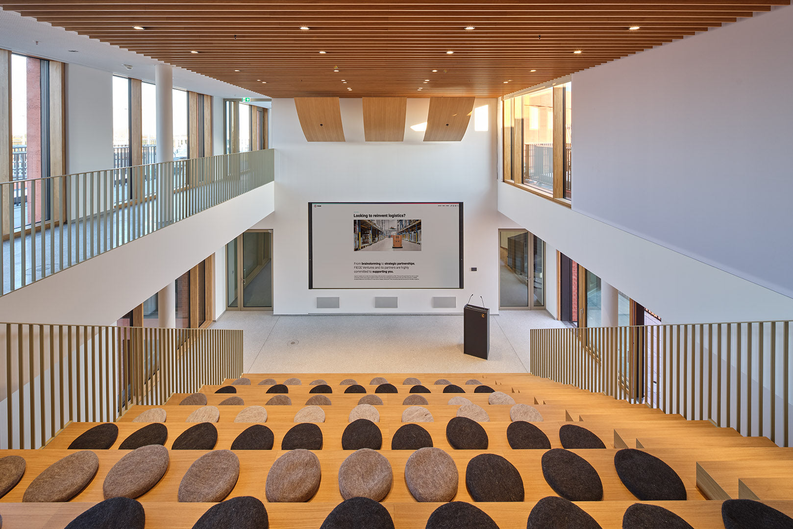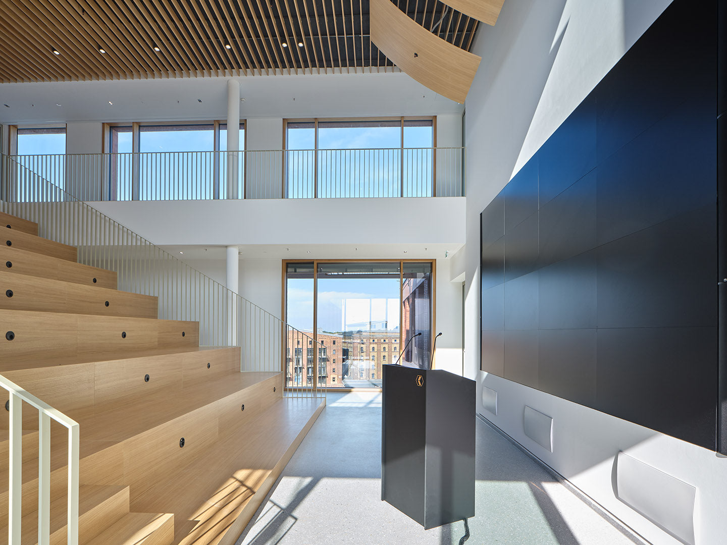 Grâce à son équipement technique, incluant des technologies de présentation modernes et des solutions d'éclairage intelligentes, l'auditorium offre une plateforme innovante pour les événements internes et externes. De grandes fenêtres apportent de la lumière naturelle et confèrent à l'espace une impression d'ouverture, tandis que des éléments textiles créent une atmosphère chaleureuse. L'espace a été conçu pour s'intégrer harmonieusement au concept global du X-Dock et répondre aux exigences d'un environnement de travail moderne.